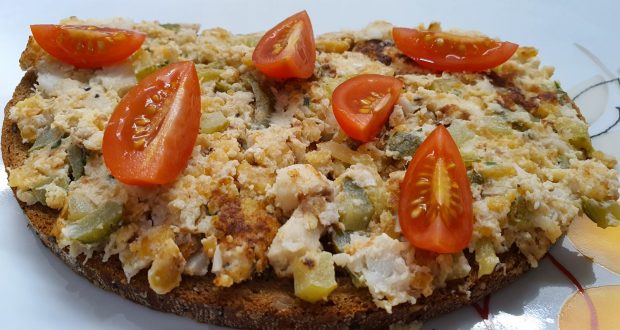 Usitnite krastavac, češnjak te odmrznute riblje štapiće i sve stavite u jednu posudu. Dodajte riblju paštetu od tunjevine, jaje, te začinite morskom solju, paprom i vlascem. Sve dobro izmiješajte te zapecite na tavi bez ulja 3-4 minute. Složite na kruh i dekorirajte. Preko cijelog sendviča po želji možete staviti i jedan list zelene salate (Romana) i kroz sredinu zabosti čačkalicu.
