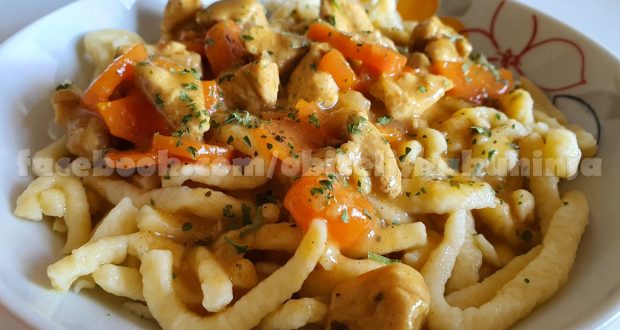 Luk nasjeckajte na sitne kockice i stavite dinstati, zatim dodajte mrkvu također nasjeckanu i meso, neka se dinsta par minuta. Zatim dodajte vode tako da pokrije meso u posudi i začine. Ostavite da se kuha sat vremena. Zatim uzmite drugu posudu i dodajte 250ml hladne vode i umak od gljiva, dobro promješajte i kada počne kuhati miješajte 5 minuta i dodajte u gulaš, gulaš kuhajte onda jos 15 minuta. Ako vam nije dovoljno gusto umutite oštro brašno i vodu i zgusnite jelo koliko želite. U drugu posudu stavite vodu kuhati, malo ju posolite, kada prokuha dodajte špecle i kada se u vodi dignu gore gotove su i izvadite ih iz vode.