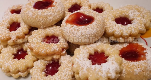 Sve sastojke stavite u posudu i umijesite. Ovo tijesto možete ostaviti u hladnjaku par dana pa praviti kada imate vremena, ali prije nego krenete praviti izvaditi sat vremena na sobnu temperaturu. Tijesto razvaljajte i modlicom pravite oblik. Uvijek gledajte da imate točan broj keksića sa rupicom i bez jer ćete ih spajati. Keksiće pecite na 180°C 6-8min. Kada su gotovi ohladite ih, onaj dio bez rupice premažite sa marmeladom, ja sam premazala s marmeladom od jagode. I onda poklopite sa keksićem s rupicom. Kada ste gotovi pospite sa šećerom u prahu.