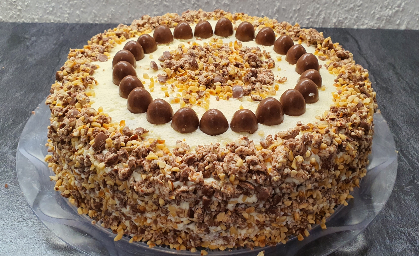 Ponovo usitnite Schoko-Bonse u blenderu i pomiješajte sa lješnjacima. Izmutite šlag za dekoraciju te dodajte dvije vrećice učvršćivača. Izvadite tortu iz hladnjaka, uklonite podesivi kalup te ukrasite cijelu tortu sa šlagom i dekorirajte sa usitnjenim lješnjacima i Schoko-Bonsima koje ste usitnili u blenderu. Prepolovite Schoko-Bonse za ukrasiti gornji dio torte, nama je trebalo 13 komada. Sa pomiješanim usitnjenim Schoko-Bonsima i lješnjacima dekorirajte okolo tortu. Sa prerezanim Schoko-Bonsima ukrasite gornji dio torte (složite ih u krug), te u sredinu stavite također usitnjene Schoko-Bonse i lješnjake.